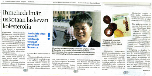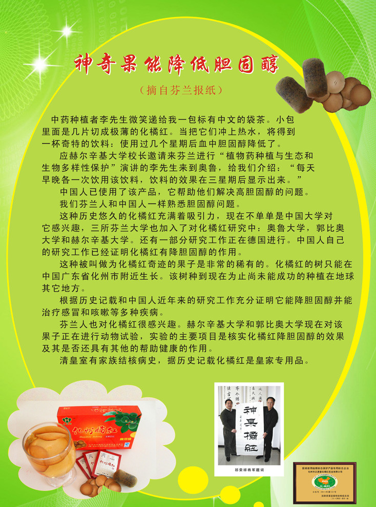 ——研究表明,化州橘红对高血脂、高胆固醇、高血压、血管阻塞硬化有明显的调节作用,是疏通软化血管、降胆固醇、降血压、降血脂的食物。 中药种植者李先生微笑递给我一包标有中文的袋茶。小包里面是几片切成极薄的化橘红。当把它们冲上热水,将得到一杯奇特的饮料:使用过几个星期后血中胆固醇降低了。 应赫尔辛基大学校长邀请来芬兰进行“植物药种植与生态和生物多样性保护”演讲的李先生来到奥鲁,给我们介绍:每天早晚各一次饮用该饮料,饮料的效果在三星期后显示出来。 中国人已使用了该产品,它帮助他们解决高胆固醇的问题。 我们芬兰人和中国人一样熟悉胆固醇问题。 这种历史悠久的化橘红充满着吸引力,现在不单单是中国大学对它感兴趣,三所芬兰大学也加入了对化橘红研究中:奥鲁大学,郭比奥大学和赫尔辛基大学。还有一部分研究工作正在德国进行。中国人自己的研究工作已经证明化橘红有降胆固醇的作用。 这种被叫做化橘红神奇的果子是非常稀有的。化橘红的树只能在中国广东省化州市附近生长。该树种到现在为止尚未能成功的种植在地球其它地方。 根据历史记载和中国人近年来的研究工作充分证明它能降低胆固醇并能治疗感冒和咳嗽等多种疾病。 芬兰人也对化橘红很感兴趣。赫尔辛基大学和郭比奥大学现在对该果子正在进行动物试验,实验的主要项目是核实化橘红降胆固醇的效果及其是否还有其他帮助健康的作用。 清皇室有家族结核病史,据历史记载化橘红是皇家专用品。